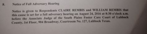 The new Adversary Hearing is set for 9/7/16 at 8:30am at the South Plains Foster Care court in Lubbock, Texas. Advocates are encouraged to come to the courthouse and protest these atrocities, done not only to the Rembis family, but to all families across America.