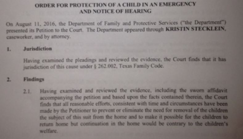 On 8/11/16, the same day the Rembis’ left Texas to get away from all the stress, Stecklein filed a petition for CPS to take emergency custody, claiming that the children were in “immediate danger,” or that they “were victims of neglect or sexual abuse or trafficking,” and that “continuation in the home would be contrary to the children’s welfare.”