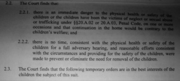 According to Texas Family Code 262.101, in order to receive an emergency removal order, there must be “immediate danger to the physical health or safety of the child or the child has been a victim of neglect or sexual abuse and that continuation in the home would be contrary to the child’s welfare,” and this must be supported by a sworn affidavit of facts, and that “reasonable efforts were made to prevent or eliminate the need for the removal of the child.”