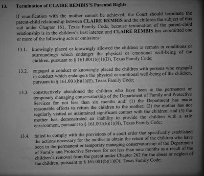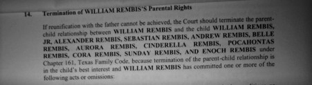 The orders also include provisions for the Rembis’ to undergo psychiatric evaluations, parenting classes, drug and alcohol assessments, and they can be ordered to pay child support, and provide medical insurance for the children in CPS custody. They can also require the Rembis’ to provide marriage licenses, and birth certificates and social security cards to establish parentage.