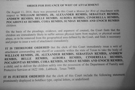 Their ordeal with Lubbock CPS began on 5/16/16, when one of the Rembis’ younger children accidentally got into their front yard alone for a few moments. Adding a few more allegations like claiming the Rembis’ hated CPS, social worker Kris Stecklein allegedly was able to obtain a court order to privately interview and photograph all of the Rembis children at the Child Advocacy Center (CAC), and to take photos and inspect the Rembis’ home.