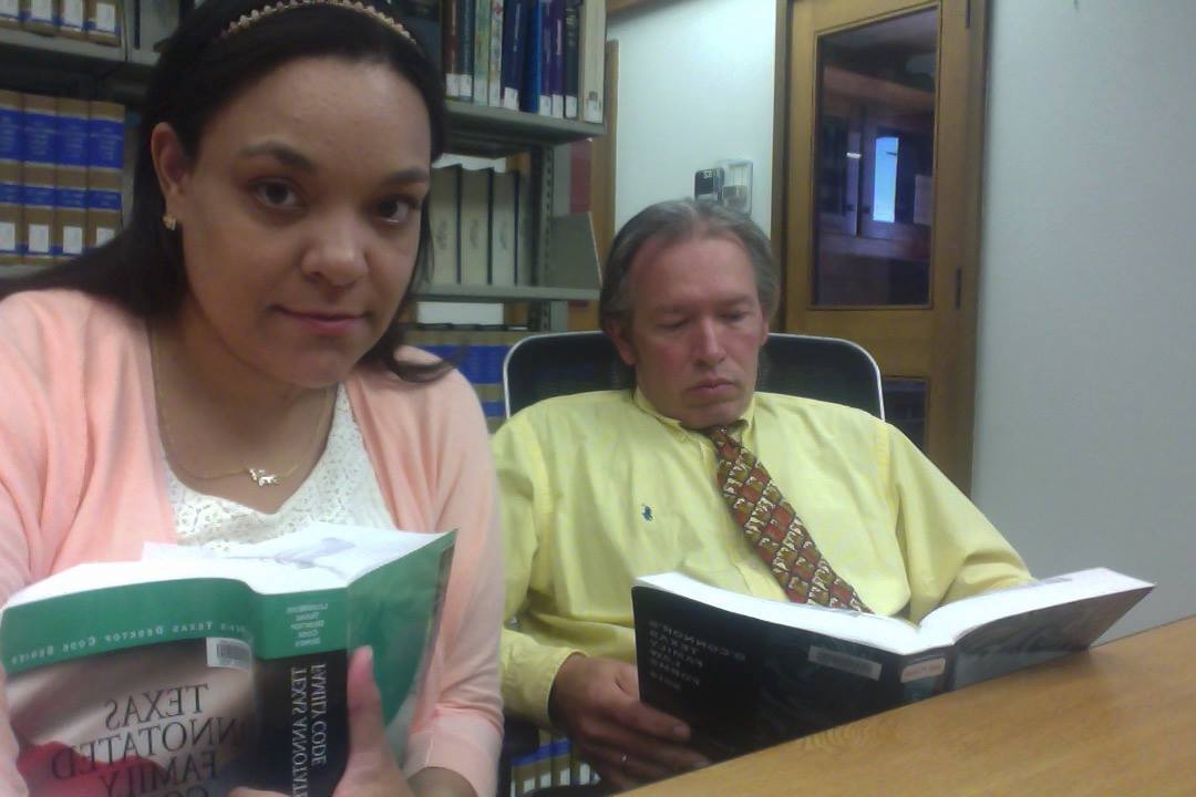 Claire and William Rembis studying law at the Texas Tech Law Library, preparing for their Adversary hearing. Image from Facebook.