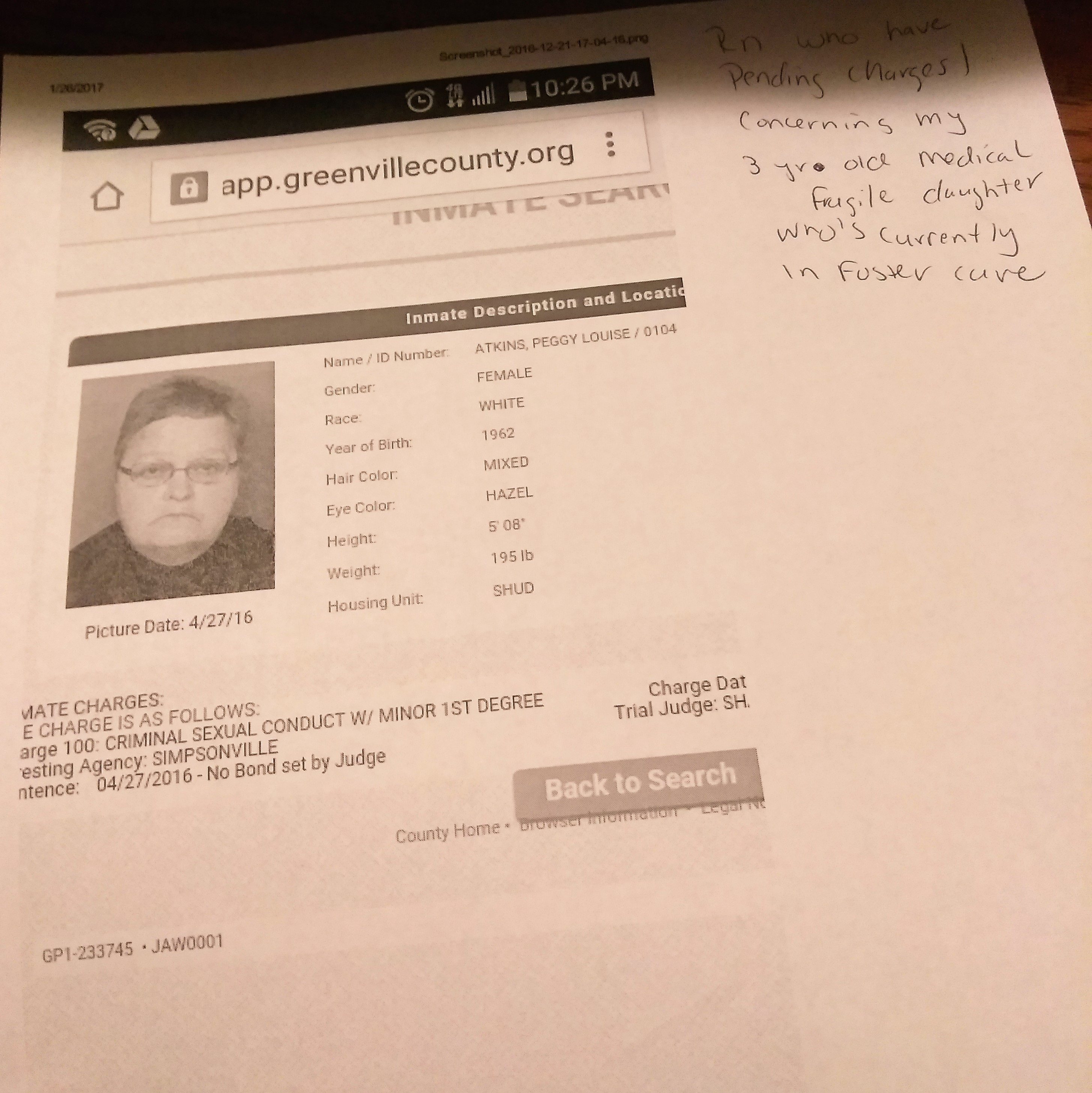 As it is, a nurse hired by DSS to provide care in the foster home was apparently not properly vetted, and the state of South Carolina has allegedly allowed serious harm to come to Egypt under their protective custody. Peggy Louise Atkins was the home health nurse attending Egypt in the home of the foster parents. She worked for a company employed by Medicare. In April of last year, Atkins was arrested and charged with Criminal Sexual Conduct with a minor in the 1st degree. Local news station WSPA has reported that the warrant cited witness testimony and photographic evidence of Atkins’ crimes against the child who could not even tell anyone that someone was hurting her.