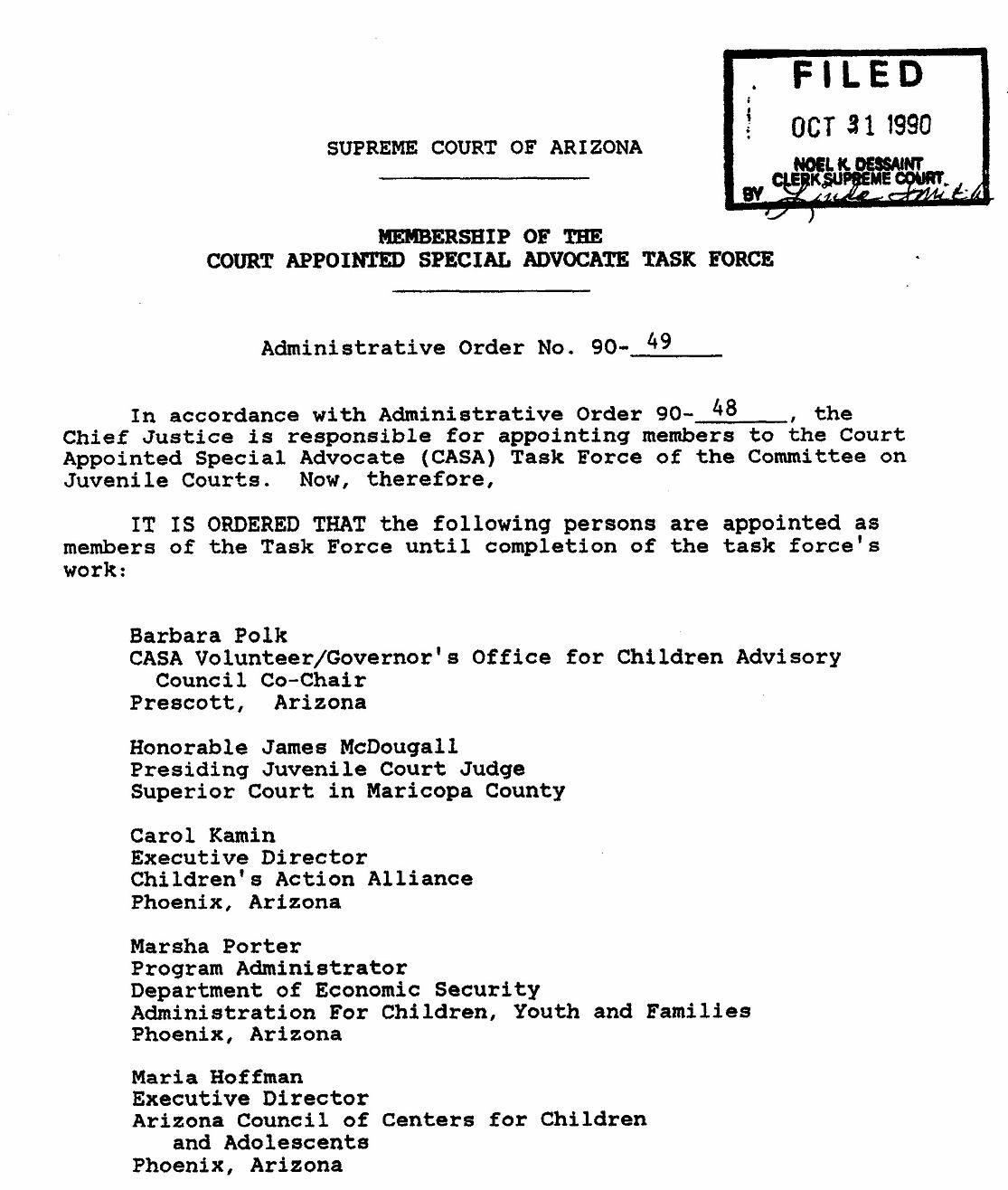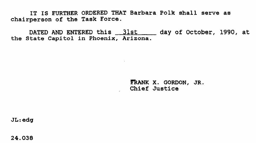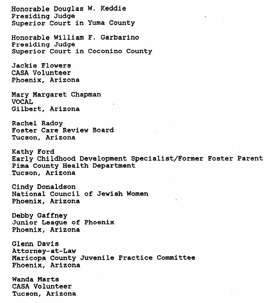 In 1990, the Arizona Supreme Court appointed her to a task force that apparently created her current position as Director of the Arizona Legislative Office of Family Advocacy.