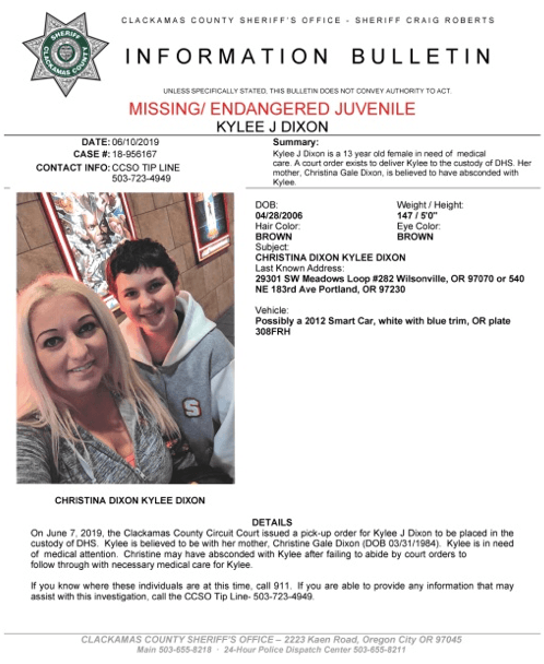 It has not been made clear why, but on June 7, 2019 the Clackamas County Circuit Court issued a pick-up order for Kylee Dixon to be placed in the custody of DHS, the state child welfare agency.