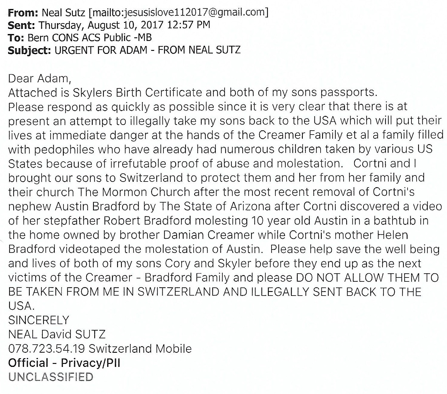 To be able to transport the Sutz boys back to the U.S., however, the Swiss CPS (SPMi) had to claim that Cortnie, the mother, was the sole biological parent of both boys, and that Neal was not the biological father of either one.