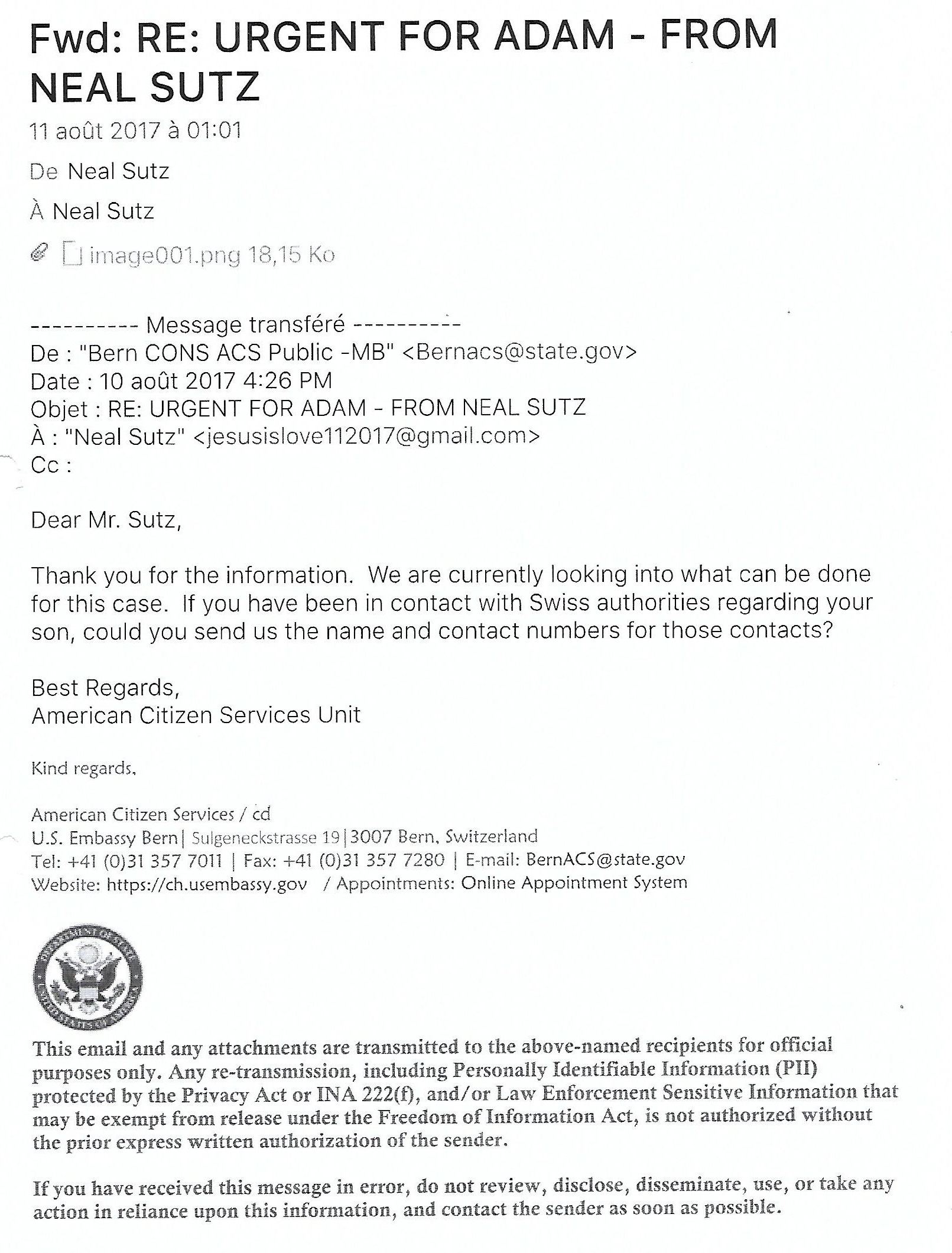 Geneva, Switzerland / August 28, 2019 – Parallel to Neal Sutz’s highly-controversial, on-going, 2+ year legal battle in Geneva, Switzerland to save his sons from the horrific conditions of their illegal detainment in a Children’s Group Home outside of Geneva, a formal, Federal Criminal Denunciation was today filed against U.S. Consulate, Jeremias Dirk, and his Senior Consular Assistant, Chris Del Monico, directly with the Office of The Attorney General of Switzerland, Mr. Michael Lauber.