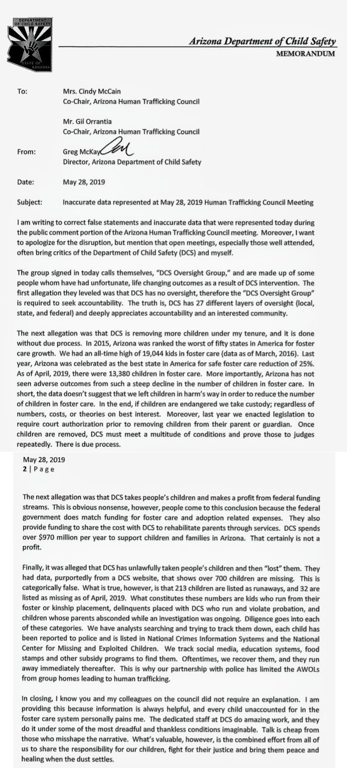 Greg McKay was employed by the State of Arizona with taxpayer funds to oversee child safety, while members of the DCS Oversight Group are all volunteers spending their own time and resources to advocate for child safety, and one has to wonder how such work is based on “false statements and inaccurate data,” while it is Greg McKay who has a responsibility to provide the sources for the claims he has made while categorically dismissing all of the efforts of the DCS Oversight Group.