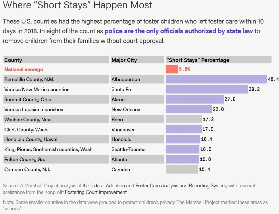 Among states, New Mexico ranked first: In recent years, about 40 percent of its foster children returned home within a few days or weeks. That’s due in part to an unusual state law that lets police unilaterally take children into foster care for a 48-hour “hold” while their parents are then investigated by child services.