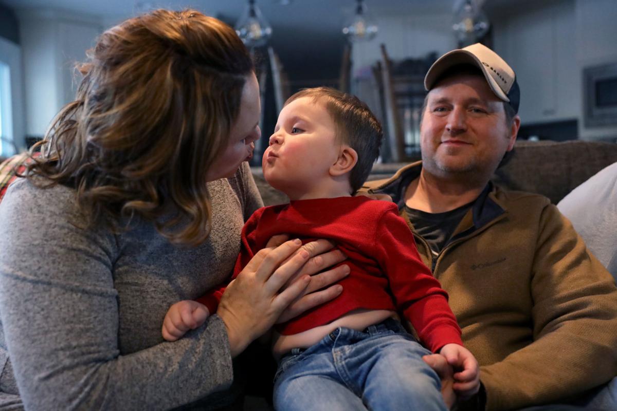 Brenna and Joel Siebold are seen with their son, Leo, 2, at their home in Mount Horeb, WI. Image Source.