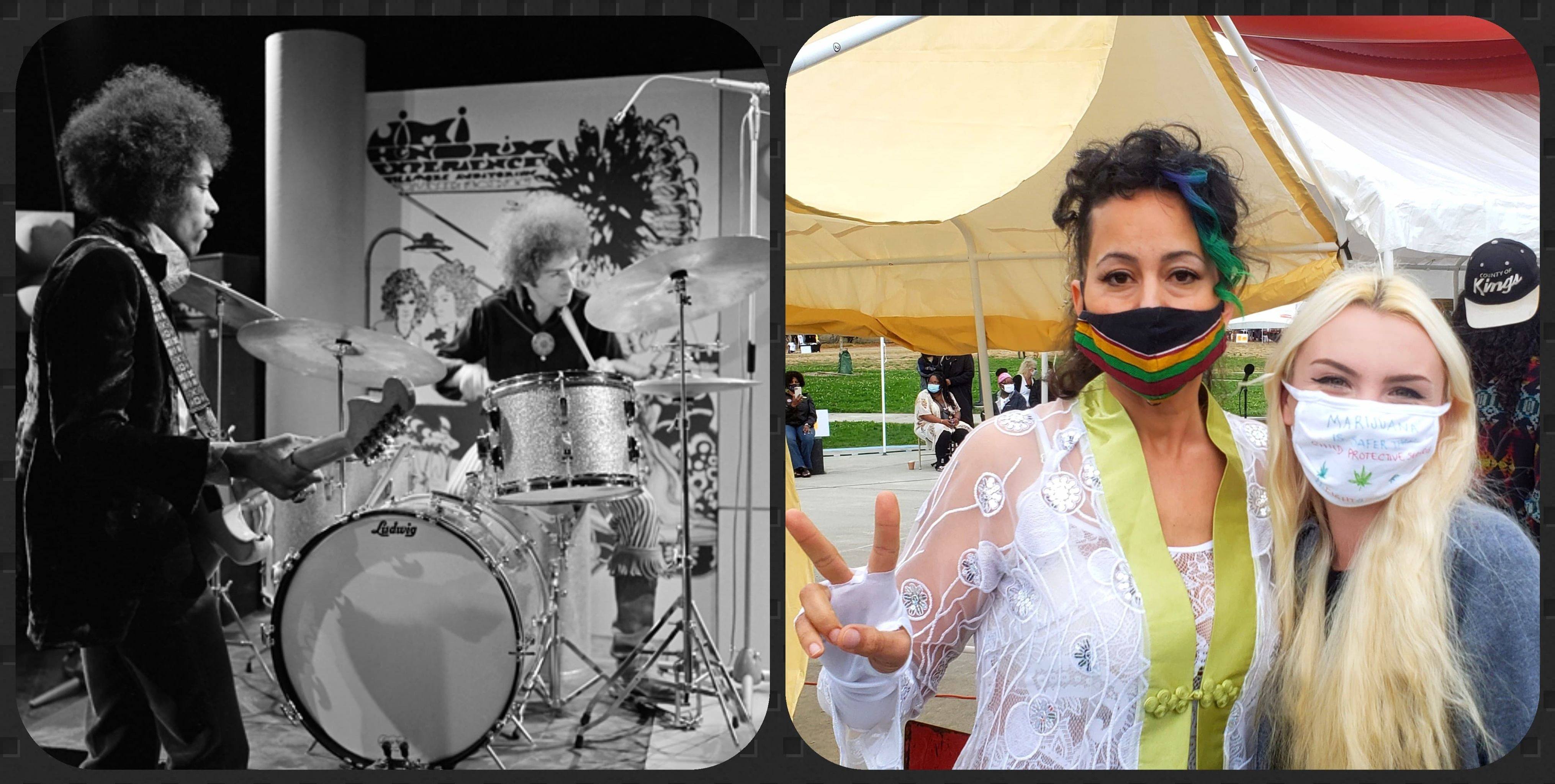 Left: Jimi Hendrix and Mitch Mitchell (Source: Wikimedia.) Right: Tina Hendrix and Sophia Rosas in 2020. Source: Family