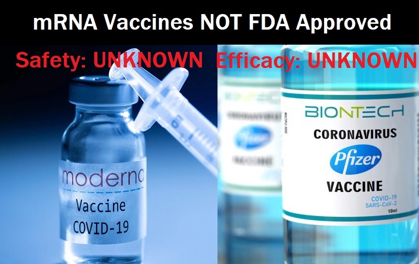 And yet, the guidelines that the FDA published when they gave Emergency Use Authorization (EUA) to these two experimental injections, make it very clear that these are experimental “vaccines” that are NOT approved by the FDA, that the efficacy and risks to these injections are UNKNOWN, and that there is a long list of possible side effects from these injections, including DEATH. See: