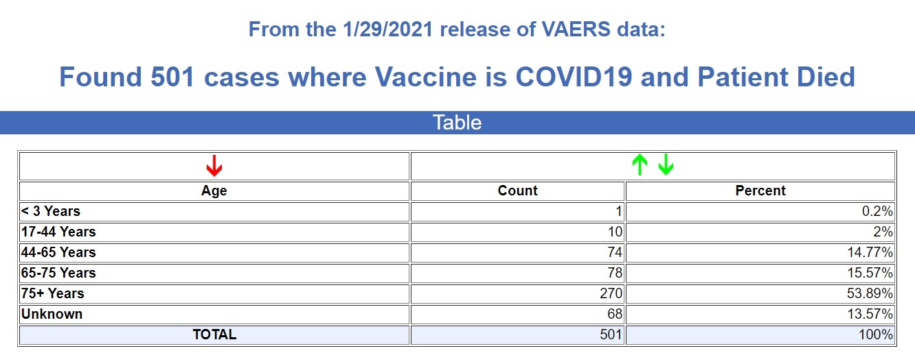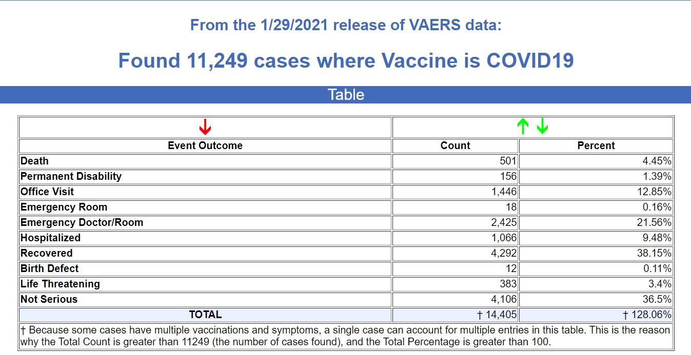 The data goes through January 29, 2021, with 11,249 recorded adverse events, including 501 deaths following injections of the experimental COVID mRNA shots by Pfizer and Moderna.