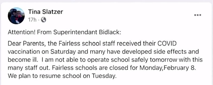 Two days after employees were given their first round of COVID-19 vaccinations, the Fairless Local School District canceled classes, attributing it to many developing side effects and becoming ill.
