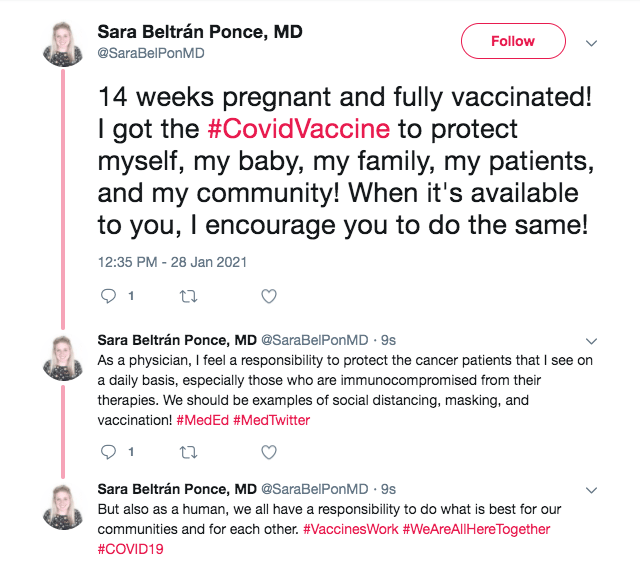 Dr. Beltrán Ponce tweeted on January 28 that she is 14 weeks pregnant and “fully vaccinated.” She repeated many of the most common talking points related to COVID-19 and vaccines in the tweet chain.