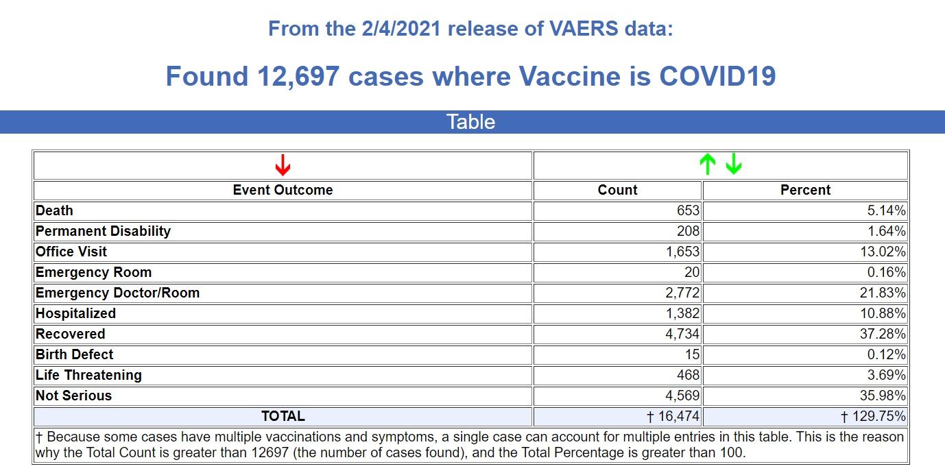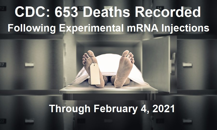 The data goes through February 4, 2021, with 12,697 recorded adverse events, including 653 deaths following injections of the experimental COVID mRNA shots by Pfizer and Moderna.