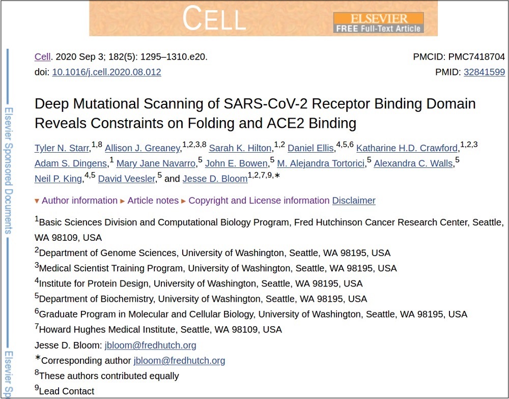 ‘Deep Mutational Scanning of SARS-CoV-2 Receptor Binding Domain Reveals Constraints on Folding and ACE2 Binding’ (Tyler N. Starr et al.)