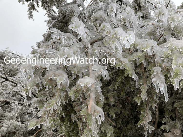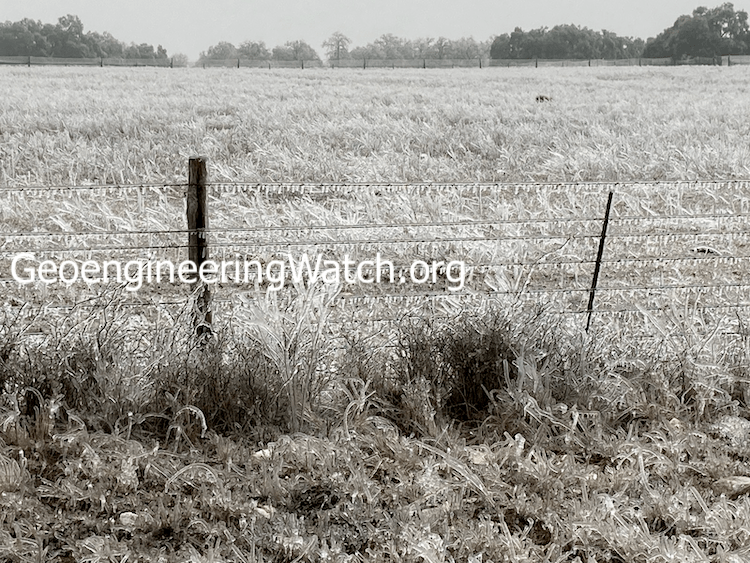 Wigington then shows some photos taken near Kerrville, Texas. He states that the images reveal the consequences of “chemical ice nucleation” operations, which he claims is based off a patented process called the Knollenberg Patent.