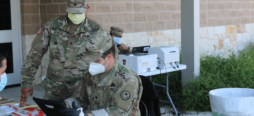 Airmen and Soldiers with the Texas National Guard perform COVID-19 testing as part of the Texas Mobile Testing Team program in Bryan, Texas. Image source.