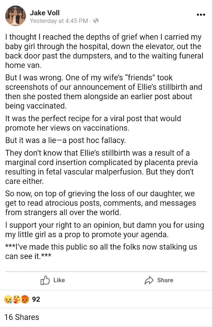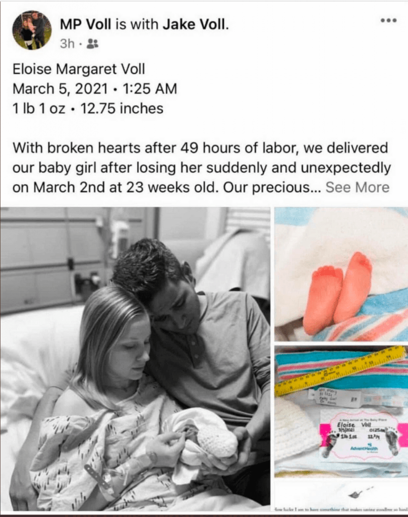 Mr. Jake Voll provided further information on the unfortunate event yesterday on Facebook. Jake said any relationship between the stillbirth and mRNA shots are “post hoc fallacy.”