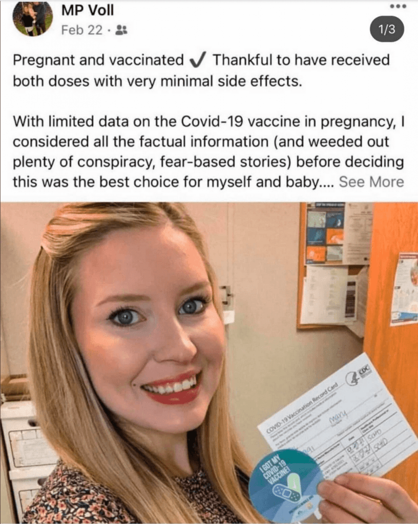 Mrs. Mary Pat Voll is a pediatric nurse in Altamonte Springs, Florida, according to her Facebook page. She posted a photo of herself holding a vaccine card, with the caption “pregnant and vaccinated” on February 22.