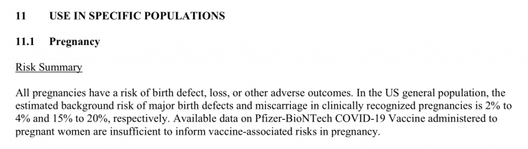 Pfizer’s own fact sheet for emergency use authorization says that there is not enough evidence to advise pregnant and child-bearing women on getting the experimental mRNA shots.