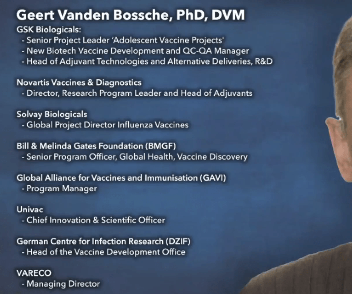 1. In his March 11 segment, Bigtree shows a slide with Vanden Bossche’s background. It indicates he’s affiliated with the Bill & Melinda Gates Foundation, the Global Alliance for Vaccines and Immunization (GAVI), GlaxoSmithKline, Novartis and other vaccine proponents. Dell dubs Vanden Bossche a “world-renowned vaccine creator.” Coleman calls him “a very eminent vaccine specialist.”