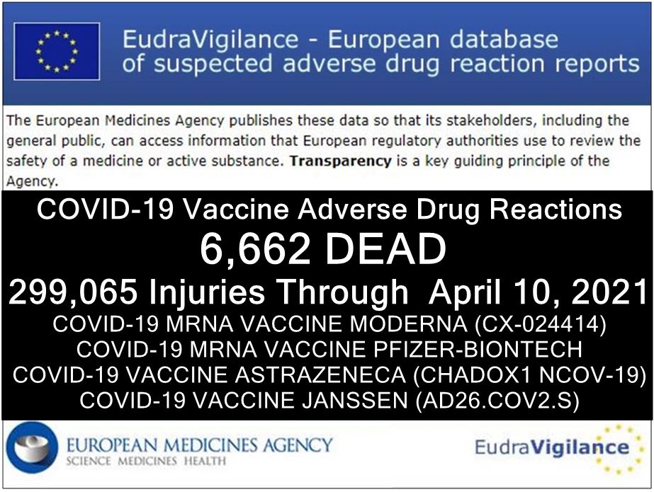 Their report through April 10, 2021 lists 6,662 deaths and 299,065 injuries following injections of four experimental COVID-19 shots:
