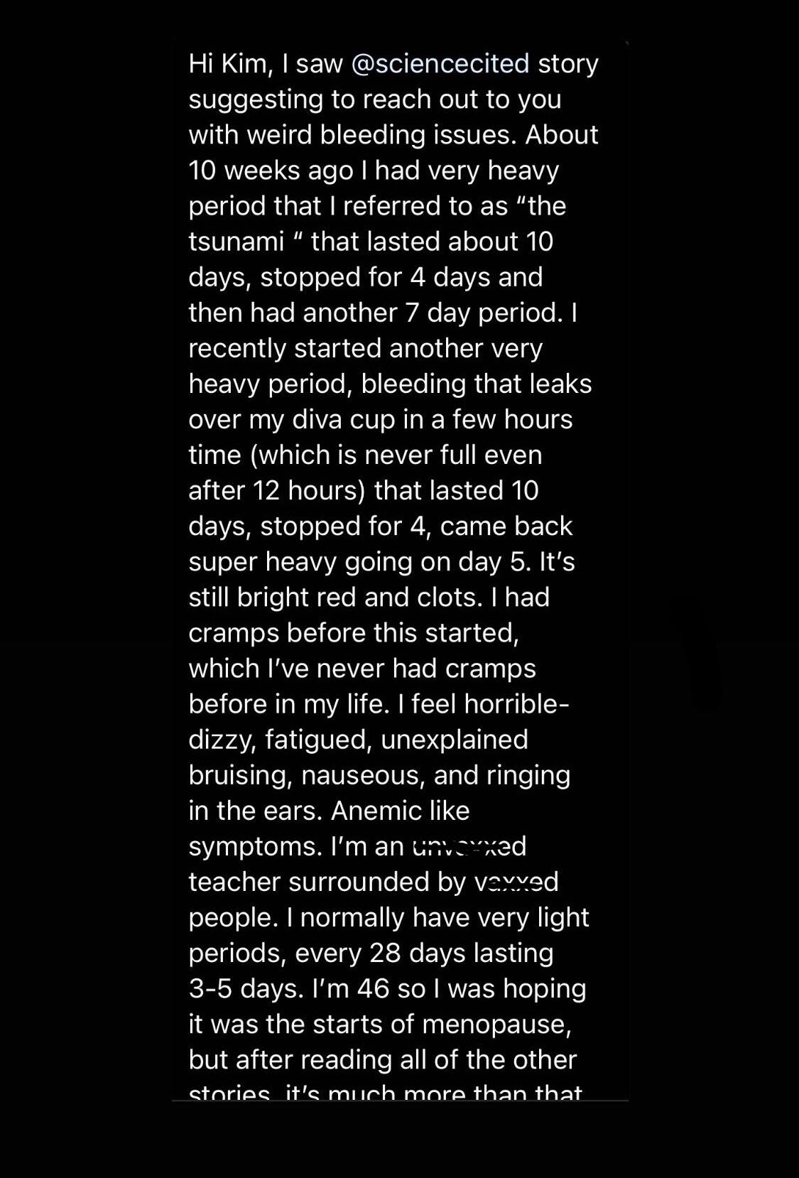 These women (and many men sharing experiences of wives, girlfriends or women they know), include bleeding, hemorrhaging, passing clots, delayed cycle, prolonged cycle, bleeding POST menopause, miscarriages, decidual casts, severe period cramping and abnormal pain, etc. The list is VAST and the influx of testimonies have been eye opening…