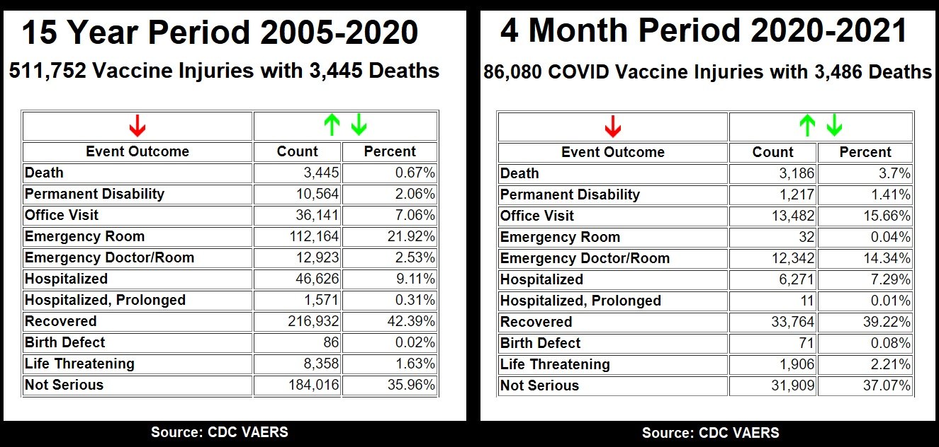Side by side comparison of 15 years of recorded vaccine injuries and deaths vs. 4 months of recorded COVID vaccine injuries and deaths. (Note: the CDC is reporting 3,486 deaths after COVID vaccines while only 3,186 are entered into VAERS so far.)