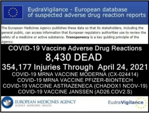 Their report through April 24, 2021 lists 8,430 deaths and 354,177 injuries following injections of four experimental COVID-19 shots: