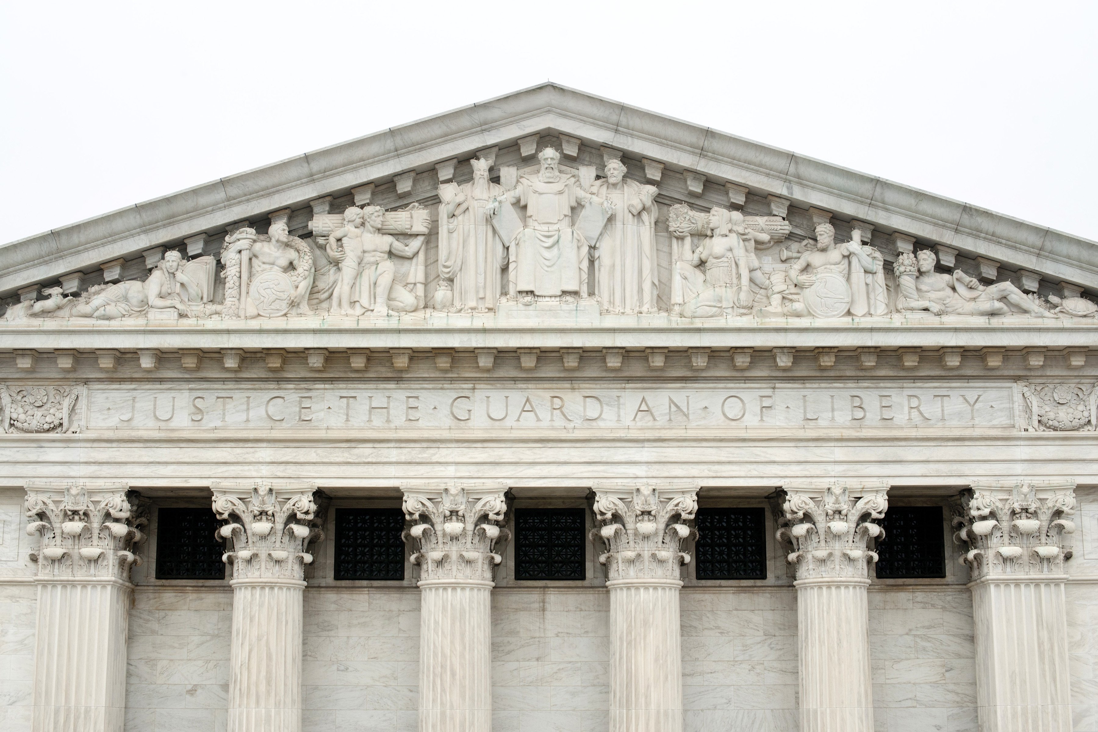 An image of Moses holding the Ten Commandments sits on top of the building of the U.S. Supreme Court in Washington D.C.