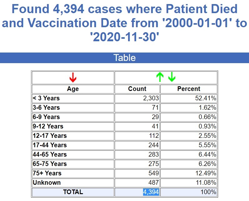 From 1/1/2000 through 11/30/2020 (the last month before COVID shots were given emergency use) there were 4,394 deaths recorded for a span of 21 years.
