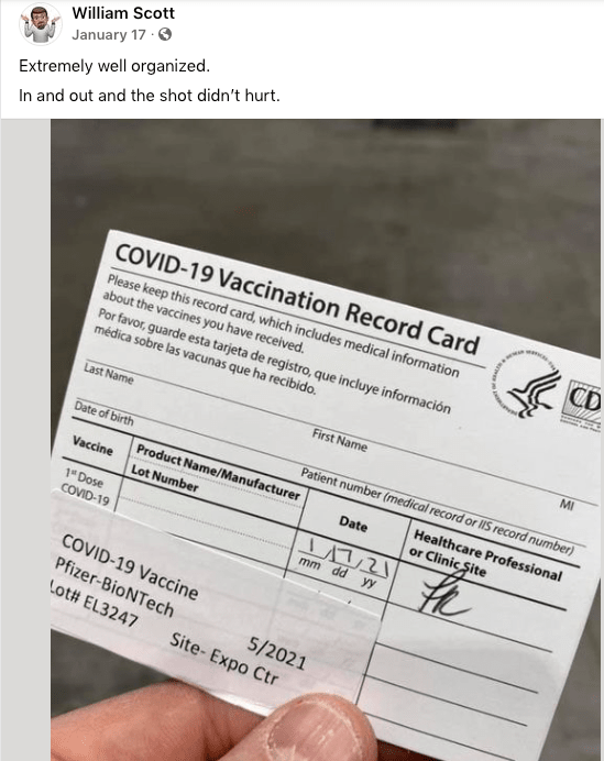 Mr. William “Bill” Scott announced on January 11 that he would receive the experimental Pfizer mRNA shot later that week at the Syracuse Exposition Center.  He posted his COVID-19 Vaccination Record Card on January 17. A bizarre lot of comments follow the post. Mr. Scott received the second dose on February 7.