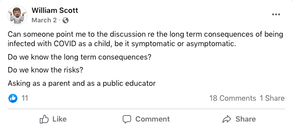 Mr. Scott posted about his opposition to schools changing social distancing guidelines from six feet to three feet on February 25. He also posted about his concern for long-term effects of COVID-infected children.