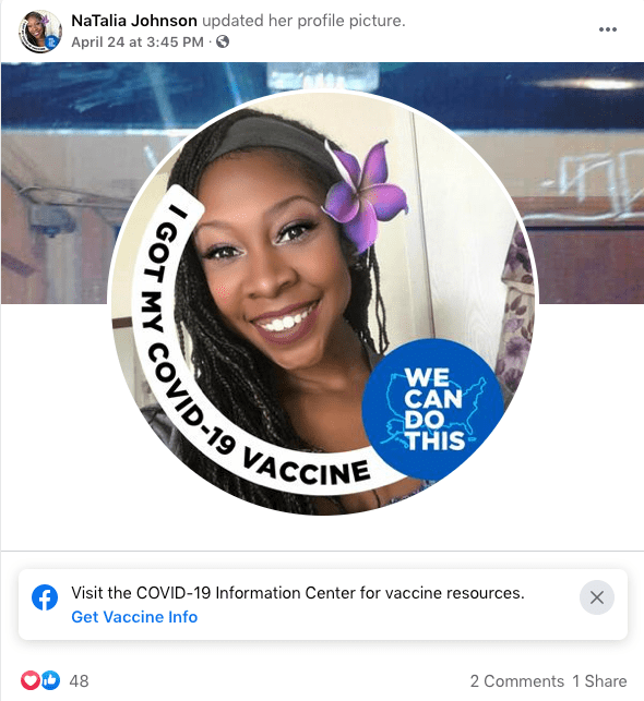 Ms. NaTalia Johnson received one of the experimental shots on April 24, according to her Facebook page. We could not confirm which shot she received. But really at this point, it doesn’t matter as all of them are equally lethal.