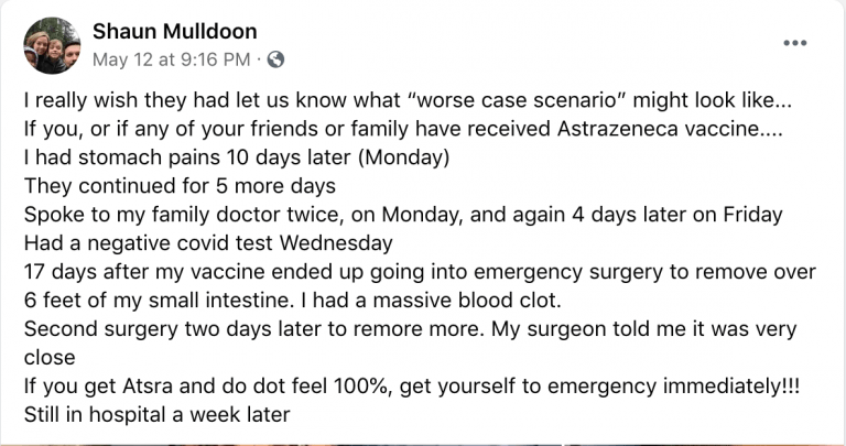 Mr. Shaun Mulldoon received the experimental AstraZeneca viral vector shot on April 22, according to his Facebook page. He began experiencing severe stomach pains around Monday, May 3.