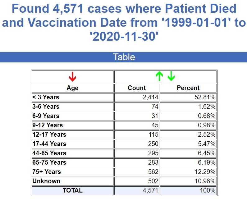 From 1/1/1999 through 11/30/2020 (the last month before COVID shots were given emergency use) there were 4,571 deaths recorded for a span of 22 years.