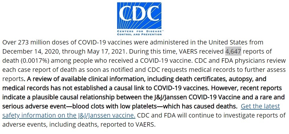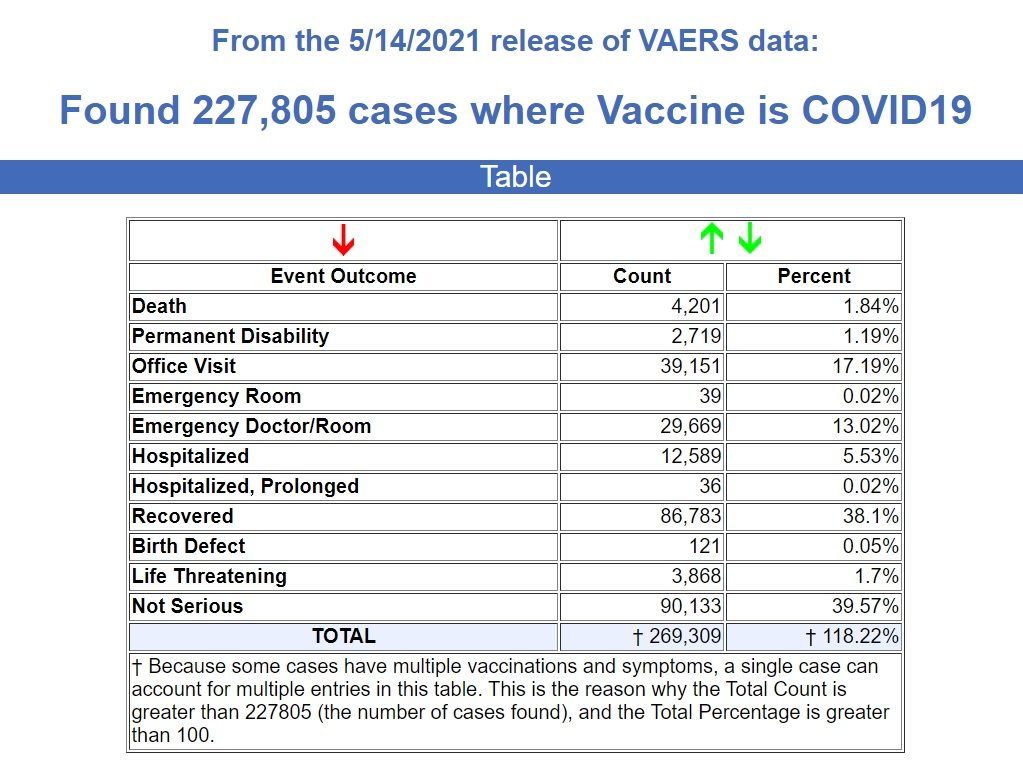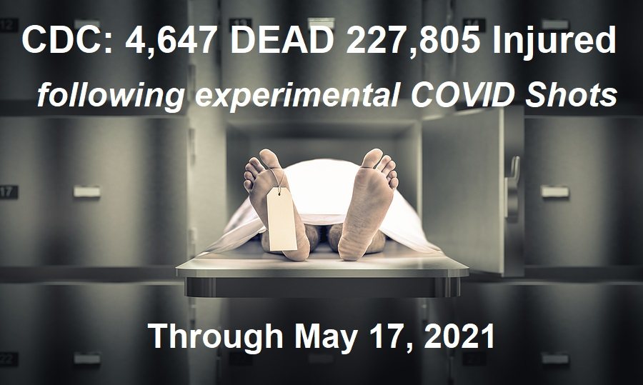 The Friday 5/21/21 data dump by the CDC into VAERS lists 4,201 of the reported deaths, along with 227,805 injuries including 2,719 Permanent Disabilities, 29,708 Emergency Room visits, and 12,625 Hospitalizations.
