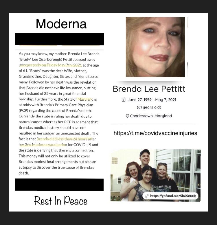 Brenda Lee Pettit of Charlestown, Maryland passed away on May 7, 2021, at the age of 61. According to a fundraiser organized by her son Chad Rapoza, she died within 24 hours of her covid Moderna vaccine.