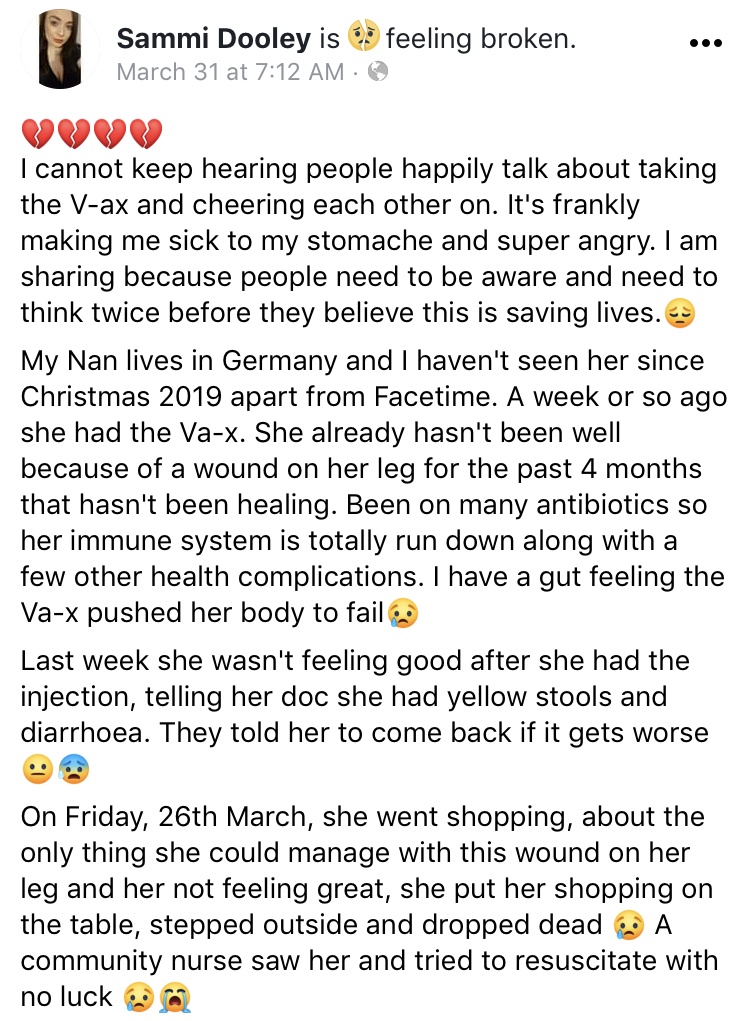 Helga’s granddaughter Sammi Dooley wrote a heartfelt post on Facebook as well. Although she doesn’t blame the vaccine entirely, she expresses “a very strong feeling it had something to do with it.”