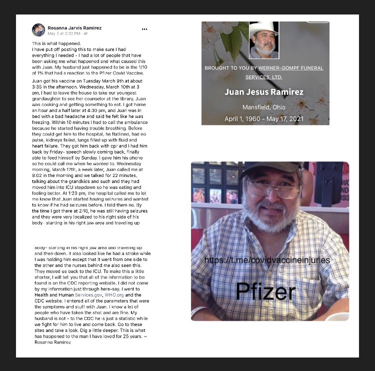 Juan Jesus Ramirez of Mansfield, Ohio passed away on May 17, 2021. It has been said that he was experiencing complications with his Pfizer covid vaccine and did not recover. Juan’s obituary also states that his death was caused by “complications of the covid vaccine.”