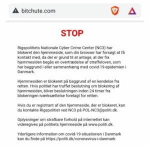 “The National Police Cyber Crime Center (NC3) has blocked the homepage that your browser has tried to access contact as there is reason to assume that from the website commits a violation of criminal law, which has a background in or connection with the covid-19 epidemic in Denmark,” states a message users see when trying to access Bitchute.