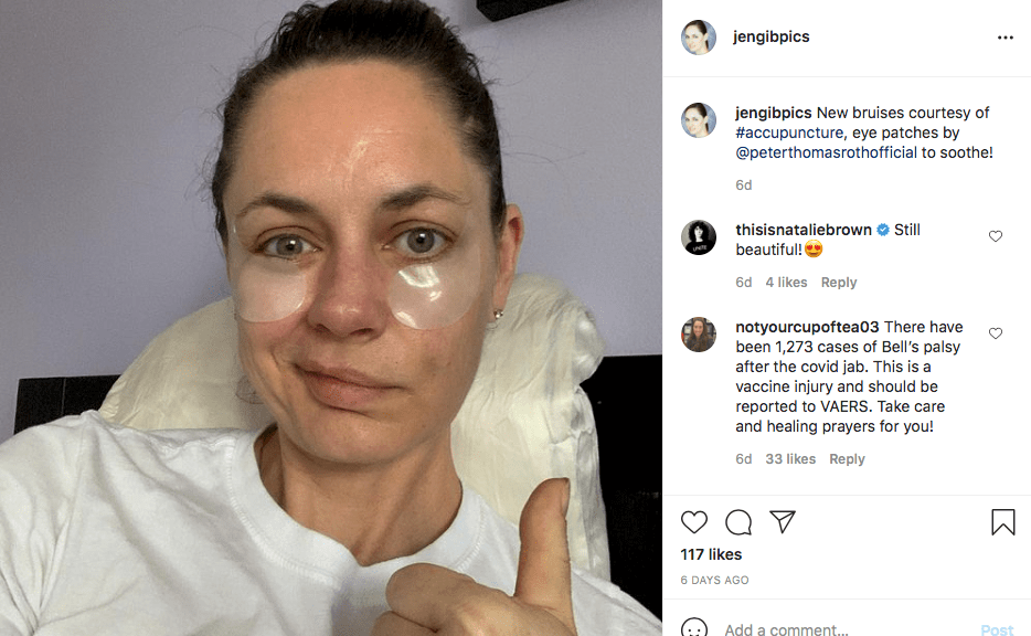 Two weeks later, she noticed her face looked different. She developed full-fledged Bell’s Palsy, a known adverse effect for all of the experimental injections, by May 18. She’s chronicling the ordeal on Instagram. Mrs. Gibson posted a photo of an acupuncture session on May 23.