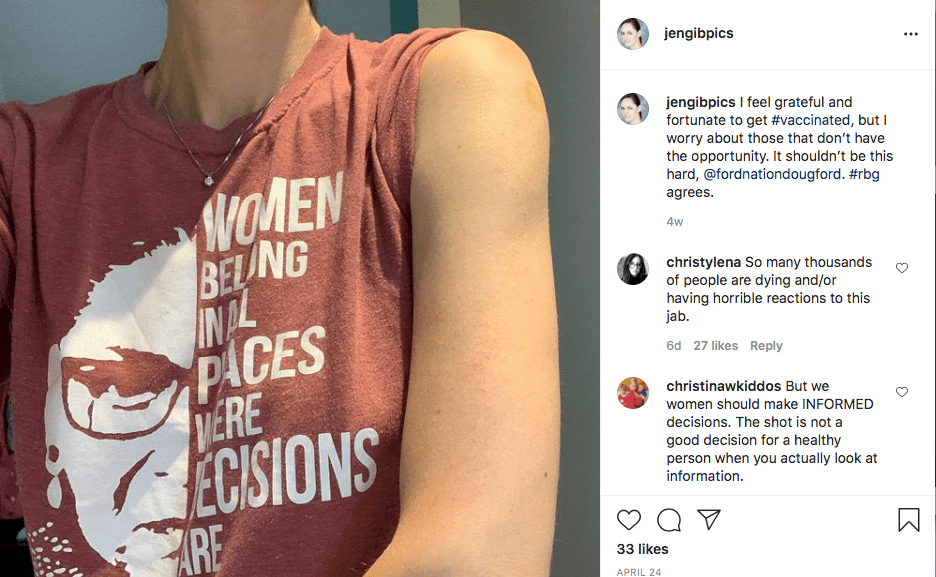 Ms. Jennifer Gibson received the experimental AstraZeneca viral vector shot on April 24, according to her Instagram page. She expressed gratefulness and apparent sympathy for those who “don’t have the opportunity” to receive experimental injections.