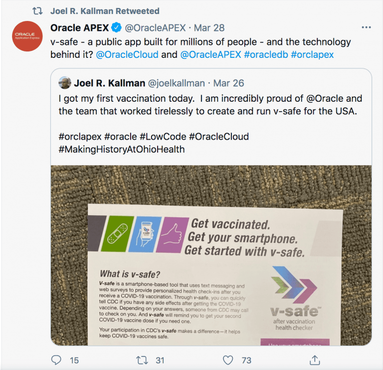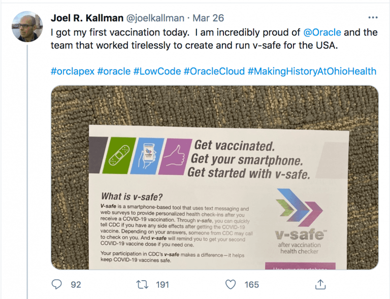Mr. Kallman received his first injection of experimental mRNA on March 26, according to his Twitter page. It’s unclear whether it was Pfizer or Moderna. He praised his team for creating v-safe in the tweet. The Oracle APEX Twitter account retweeted Mr. Kallman two days later, further gloating about how they created the v-safe platform.