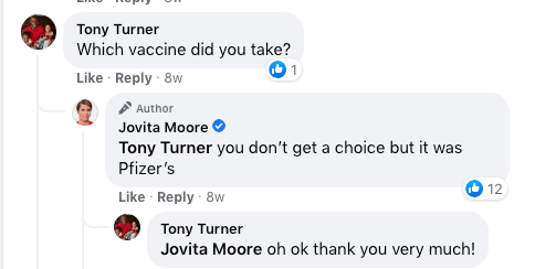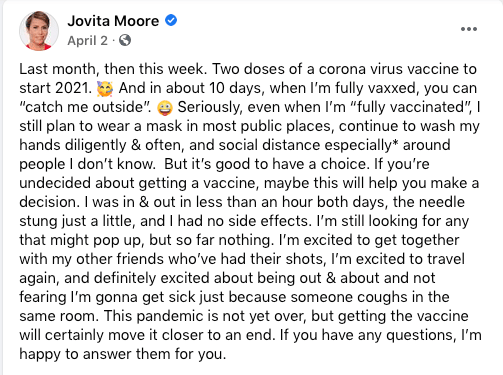 Ms. Moore received the second dose of experimental Pfizer mRNA on April 2, according to her Facebook page. Her Facebook post that day is full of sad, dramatic irony.
