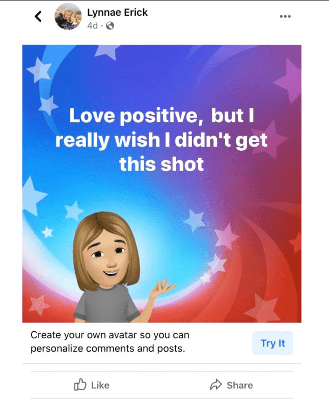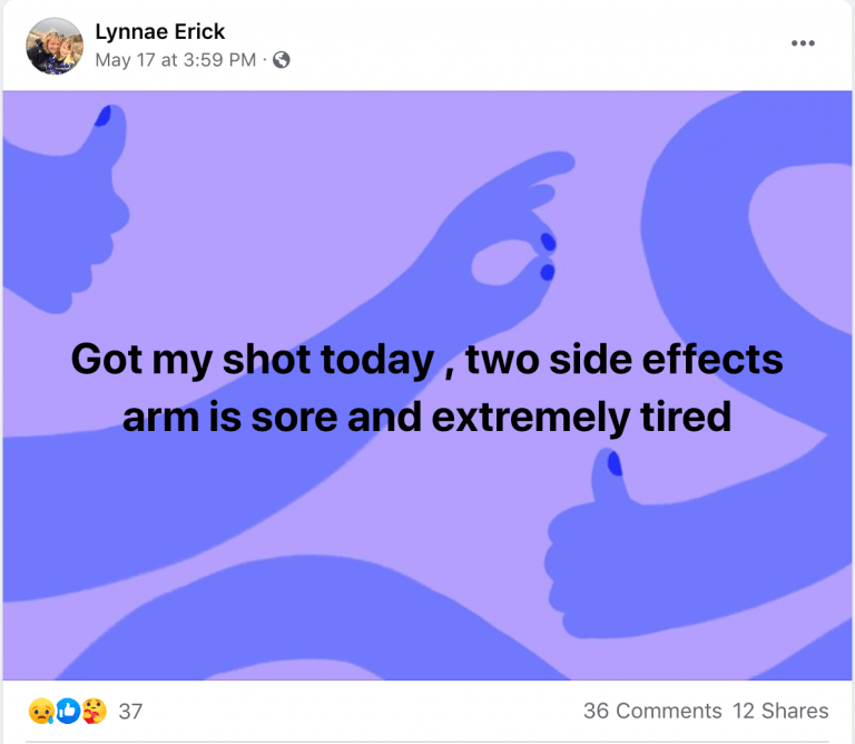 Mrs. Lynnae Erick received the first dose of experimental Pfizer mRNA on May 17, according to her Facebook page. She first said the shot was AstraZeneca, but corrected herself in the comments section. Mrs. Erick immediately reported a sore arm and fatigue.