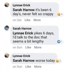 The foregoing post has since been deleted. Many friends and relatives started expressing concern. One suggested she take colloidal silver. Another told her to call 811, a health advice line in Canada.