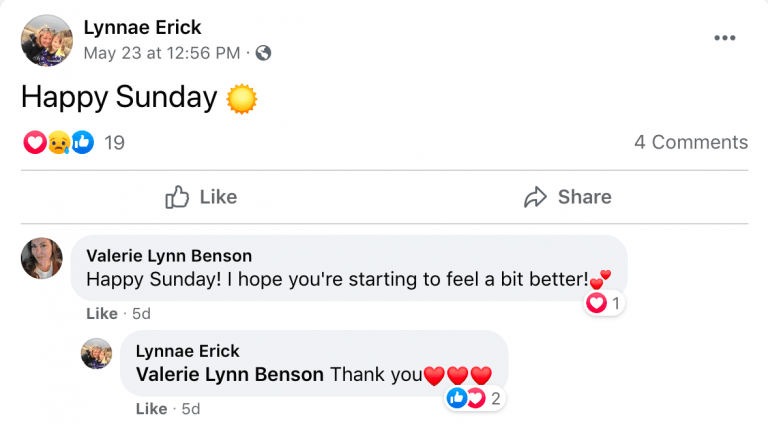 Her condition progressively worsened over the next week. While she posted many positive messages (as was obviously her nature and normal self), Mrs. Erick was suffering. She said her neck was sore and she could not stay awake at all. Mrs. Erick posted a very sad update on Saturday, May 22.